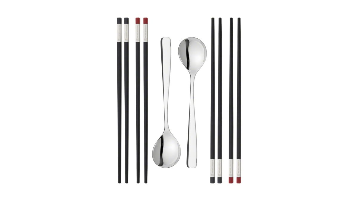 Mit dem ZWILLING Chopstick-Set für vier Personen erhalten Sie das ideale Starterparket für alle Liebhaber der asiatischen Küche und für alle, die es noch werden wollen. Das Set beinhaltet vier Paar schwarze Stäbchen, die aus synthetischem SPS-Material gefertigt sind. Komplettiert wird das Set durch zwei Löffel aus rostfreiem Edelstahl.